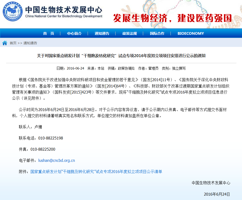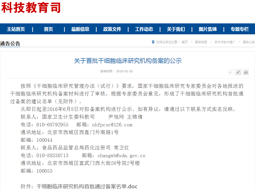 按照《干細(xì)胞臨床研究管理辦法(試行)》要求,國家干細(xì)胞臨床研究專家委員會(huì)對各地報(bào)送的干細(xì)胞臨床研究機(jī)構(gòu)備案材料進(jìn)行了審核,根據(jù)專家委員會(huì)意見,形成了干細(xì)胞臨床研究機(jī)構(gòu)首批通過備案的建議名單(見附件)。 從即日起至2016年6月8日對擬備案機(jī)構(gòu)進(jìn)…